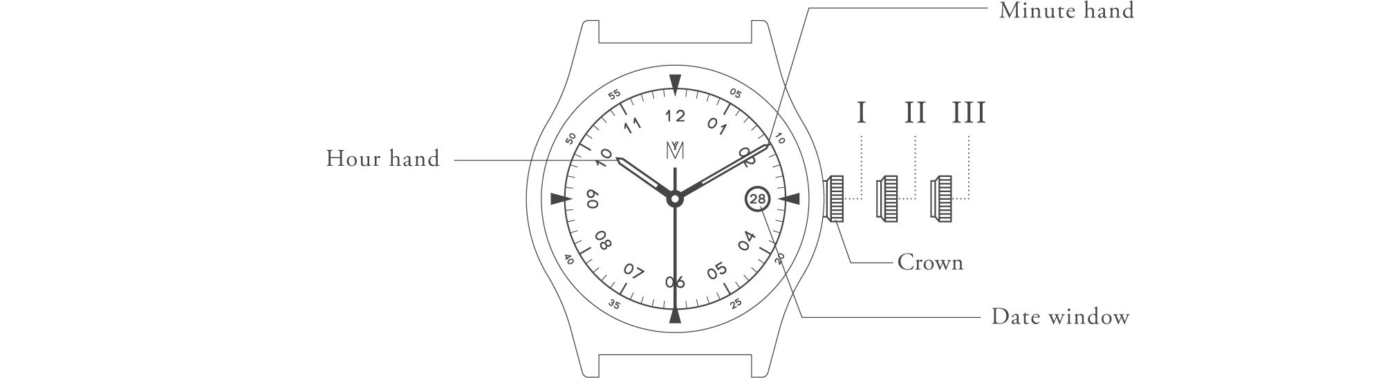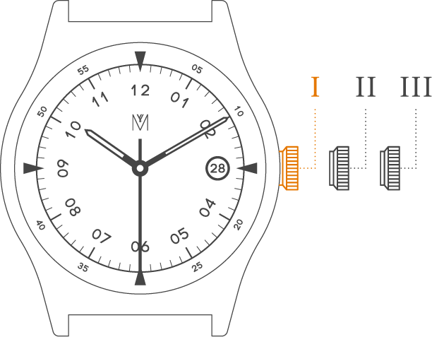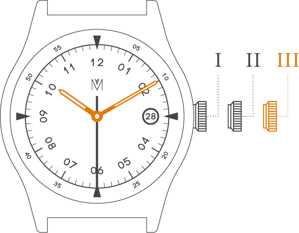 Pull out the crown to position III and turn the crown counterclockwise to set the hour and minute hand.