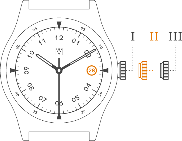 Pull out the crown to position II and turn the crown counterclockwise to set the date.