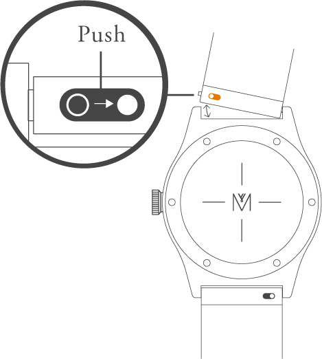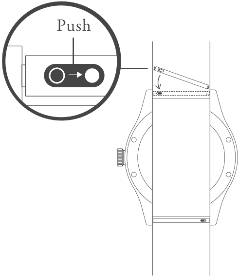3. Place one end of the spring bar into the lug hole, then insert spring bars by pushing the pin inward. Make sure the spring bars snap into the lug holes.