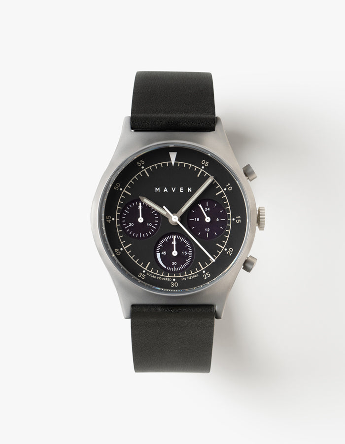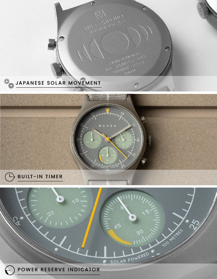 The MUS Solar Chrono embodies MAVEN's minimalist silhouette, blending timeless style with uncompromising quality. Inspired by a deep study of watch movements, we landed on a solar chronograph movement developed by Seiko Epson, which works by converting light energy into electronic energy. This approach showcases our commitment to advancing watchmaking technology while maintaining a classic aesthetic.